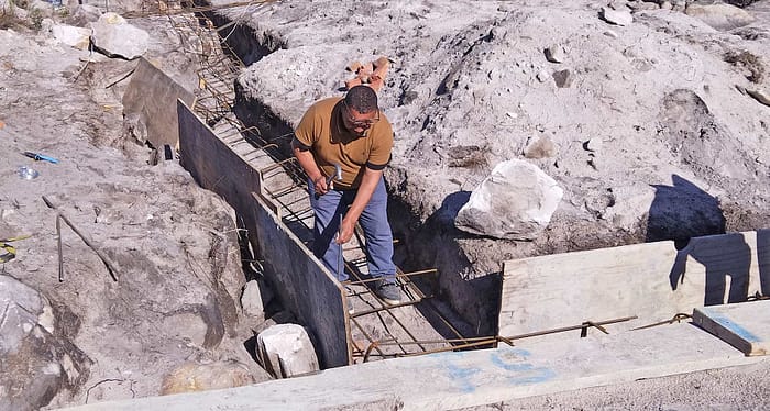 Gently wet the excavation trenches before placing the concrete to avoid moisture being drained out of the concrete mix into the surrounding soil as this could weaken the foundation.