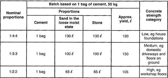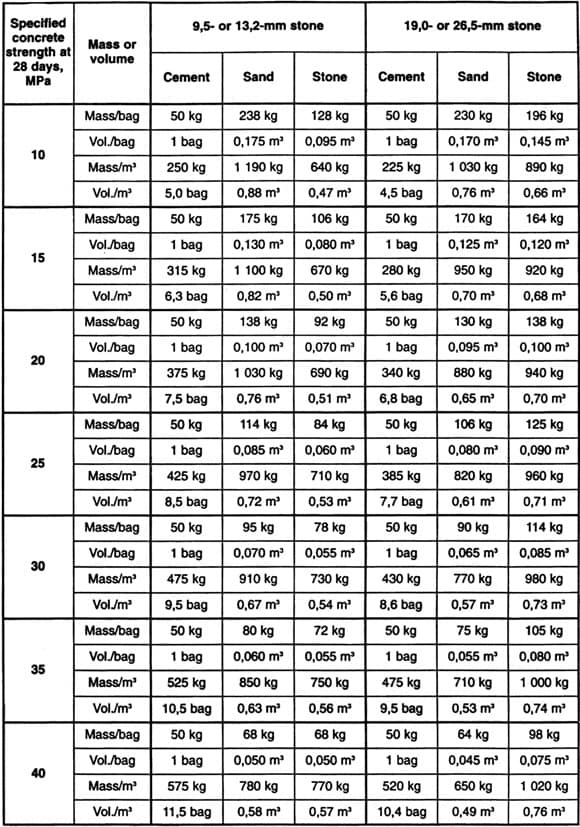 The mix proportions in the table are by mass and volume, using different size stones, for different strengths of concrete. You must add water to the mixture until it becomes workable; you can judge this by eye. The difference between various types of cement and aggregates is not taken into account with these mixes. Make sure that the water is kept together with the mix and is not allowed to drain/run away as this could result in a weaker mix.