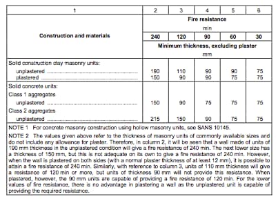 There are several tables (five in all) that indicate requirements for compliance with “Presumed fire resistance of building materials and components”.