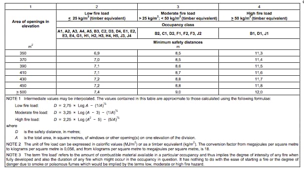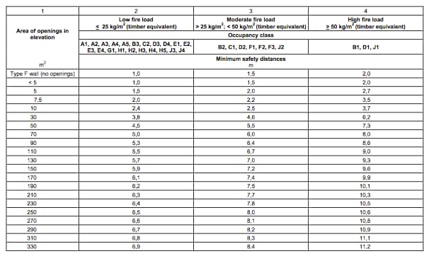 Table 2 shows the safety distances. For a residential dwelling (classified as low fire load), if the area of the openings “in elevation” are less than 5 sq m then the distance is 1 m. The distance then increases according to the area of the openings. So if they are 10 sq m the distance increases to 2,4 m; if they equal 210 sq m, the distance increases to 6,3 m. Nothing less than 1 m is allowed.