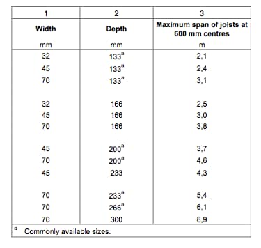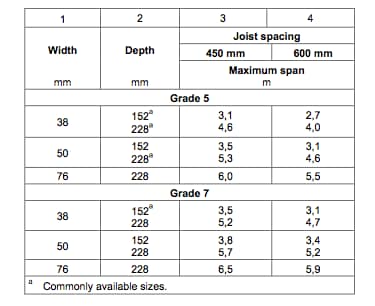 There are also specifications for maximum spans of floor joists:
