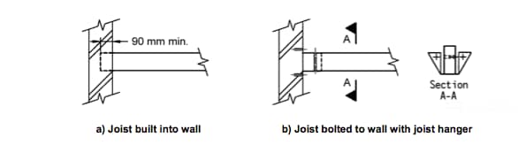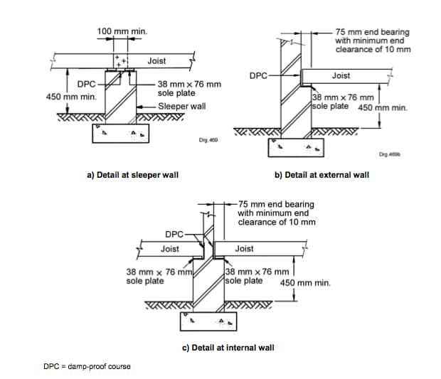 “Floor joists in suspended ground floors shall be set on and skew-nailed to sole plates that have minimum dimensions of 38 mm × 76 mm on top of sleeper walls (see figure 2). Sleeper walls shall be provided with sufficient openings to ensure good cross ventilation.