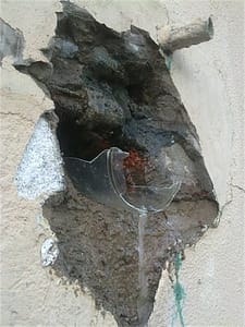 Having tracked the source of the flooding water to a corner of the kitchen, we were able to help the new (to us) plumbing expert find out where the leak was. It wasn’t too difficult since the water was pouring out on the outside at a position that coincided with what was clearly a poly-filled track down the wall for several metres, close to the geyser outlet pipe.