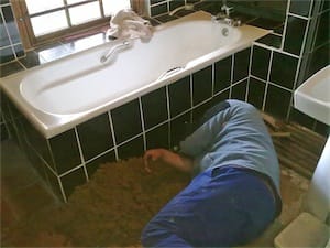 The most recent leak was, as described in my previous post, under one of our baths. The trusty plumber who repaired two of the previous six leaks (we were able to remedy the others) was “too expensive”. But then he doesn’t know the layout of the internal pipes, and envisaged the repair would involve lifting the bath.